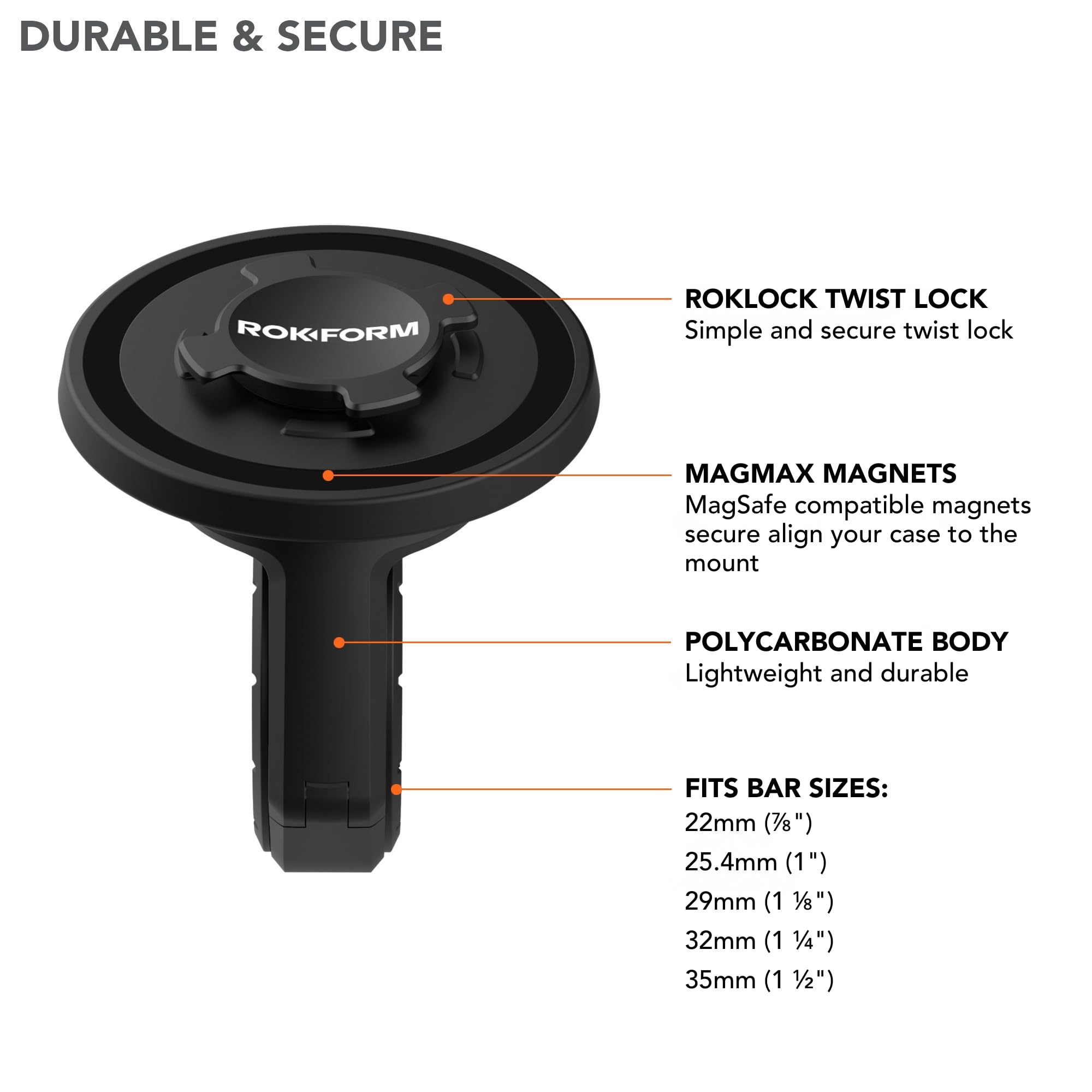 - SECURE MOUNTING: Rokform's RokLock twist lock system + powerful MagSafe compatible magnets to help align your phone AND safety lanyard to further secure phone to your bar.